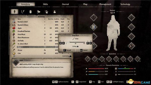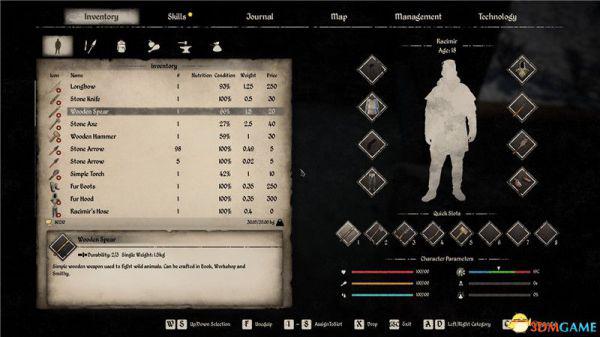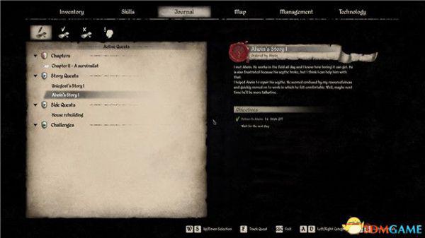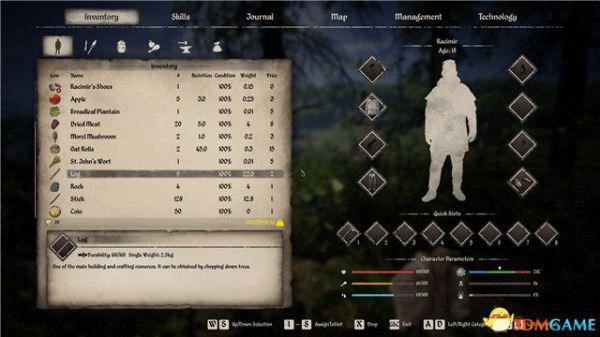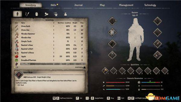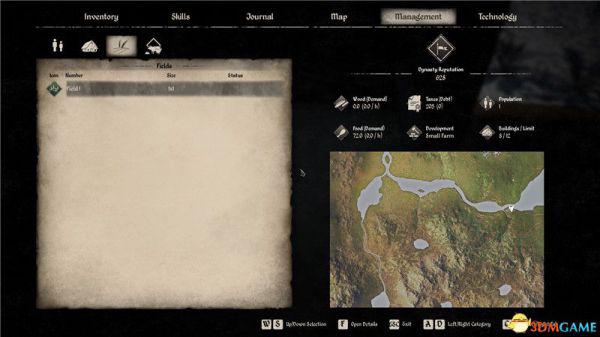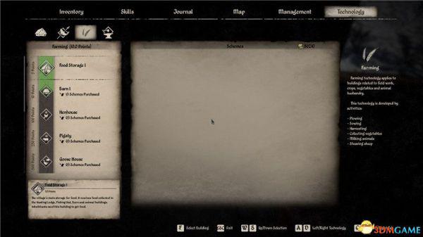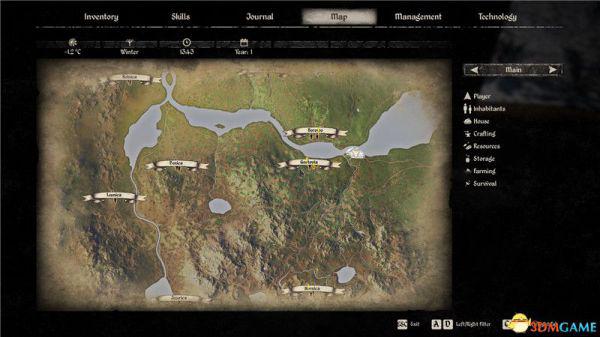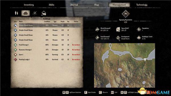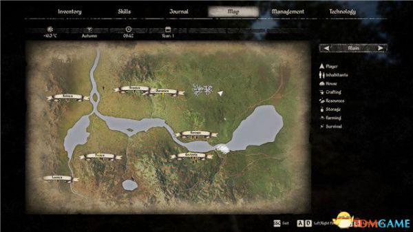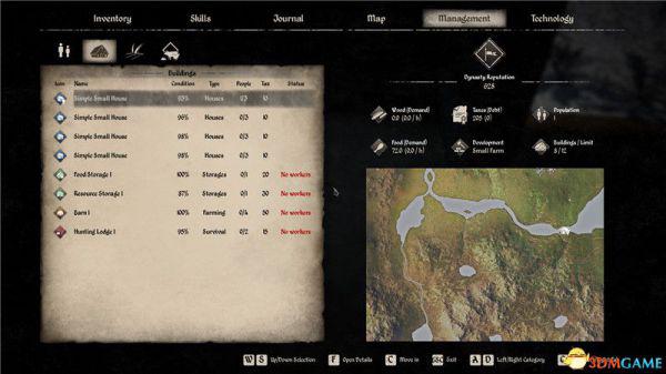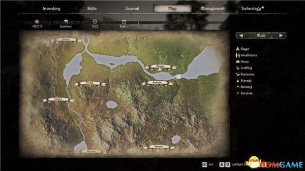 功能菜单分为很多栏,有角色的物品背包栏,技能树,科技栏,地图,王国领域管理。