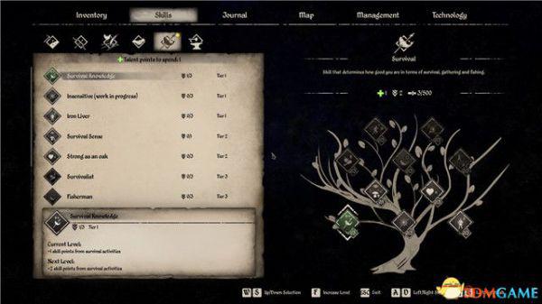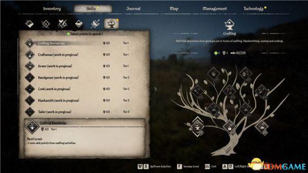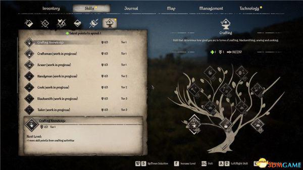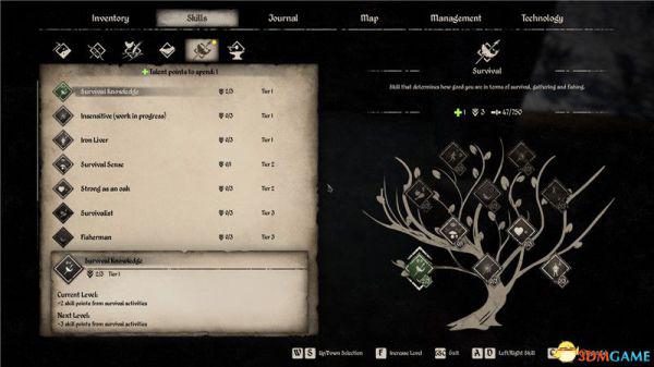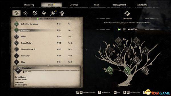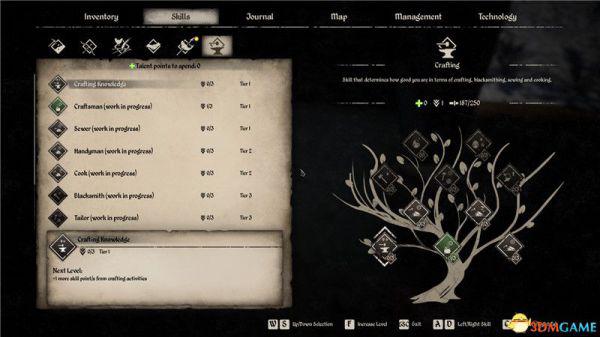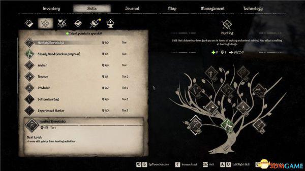 每一次建造,狩猎,制作都会提升对应技能树的提升。