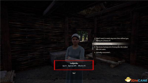 当赞许值达到70%以上,你还可以和一些未婚女子进行调侃求爱,此时会出现一个“暧昧值(Affection)”。