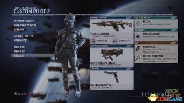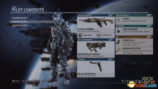驾驶员可以设定主要武器、反泰坦武器、次要武器、战术能力以及手榴弹,还有两个技能包