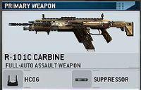 R-101C卡宾枪,全自动突击步枪,可装配机瞄、红点、2.4倍光学瞄具、不知名圆形瞄具、枪口抑制器,其他未知。
