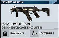 R-97紧凑式冲锋枪,为近距离遭遇战设计,可装配机瞄、红点、发散式火力(?),其他未知。
