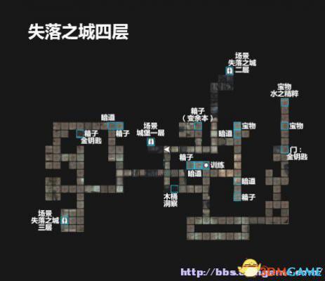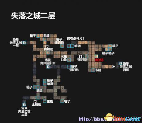 0.18 场景:失落之城1层 7.11 场景:海洋庇护所 4.5 墙壁暗道 13.13 木桶:力量 3.5 箱子 21.14 BOSS:蒙特博德 6.6 墙壁暗道 14.17 箱子,金钥匙 6.7 箱子 4.2 上锁的门(需要金钥匙) 11.1 箱子 6.1 宝物 0.0 场景:失落之城3层 13.17 圆石盘碎片3 13.11 箱子,铜钥匙 25.17 箱子 7.15 上锁的门(需要铜钥匙) 25.16 箱子 6.19 墙壁暗道 24.16 箱子 4.20 箱子 20.10 书籍:蒙特博德的日记节选 11.17 箱子,银钥匙 28.12 场景:失落之城4层 18.14 上锁的门(需要银钥匙)