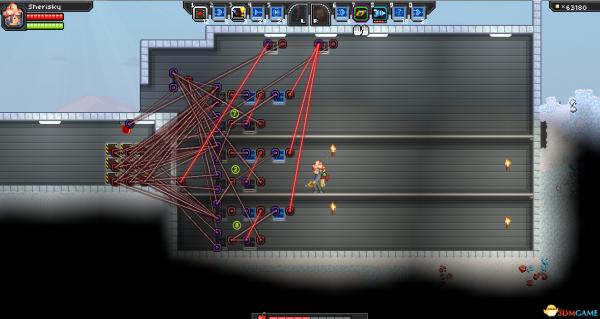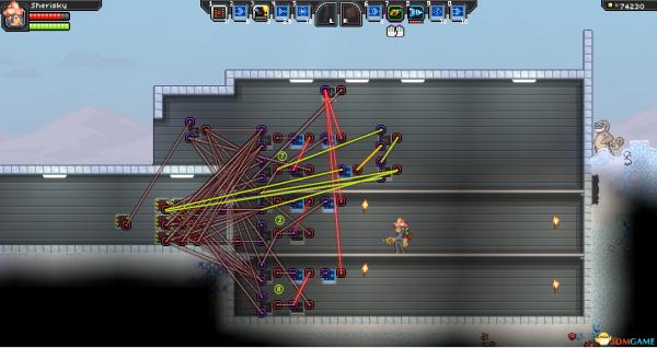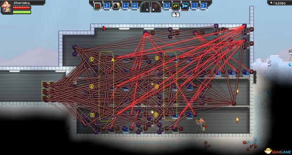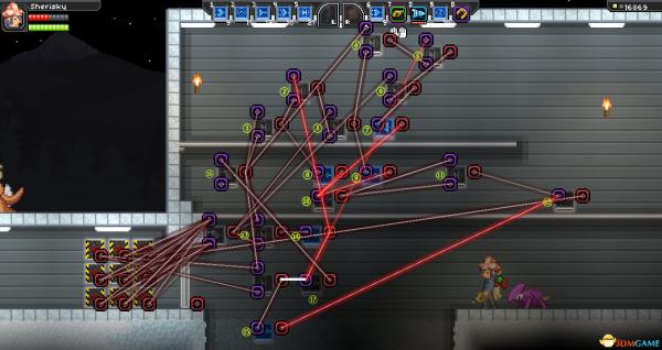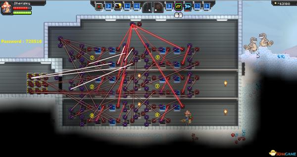 通过的就是:当前一个数字输入后打开后一个数字锁存器的修改权限(例如当与数字7对应的锁存器亮起后,输出高电平到2负责接收错误信号的锁存器上端,这样当有错误信号产生的时候,这个锁存器会输出一秒的高电平将整个电路初始化,但当我们第一次输入7的时候,由于2没亮,故不会改变8上端锁存器的输出类型,这样在8的错误端就能连接7了)。也就是说,相对于地砖密码,第二个数字往后的部分都可以将负责接收错误信号的锁存器与上上个数字相连。