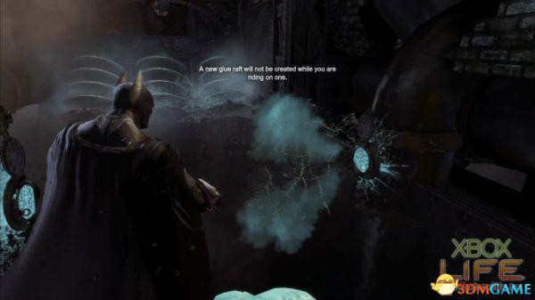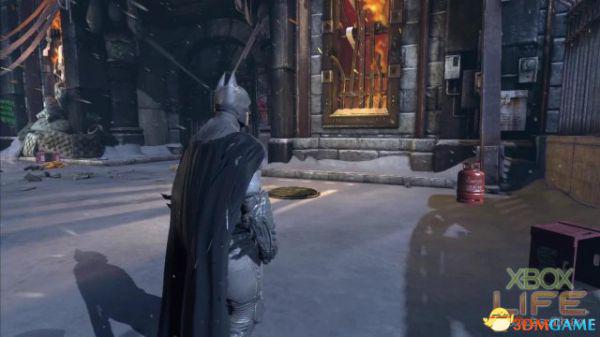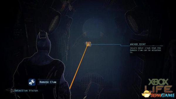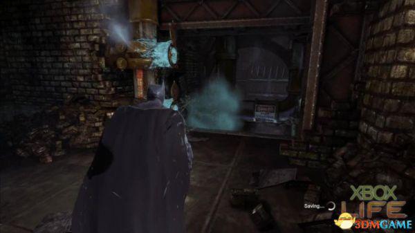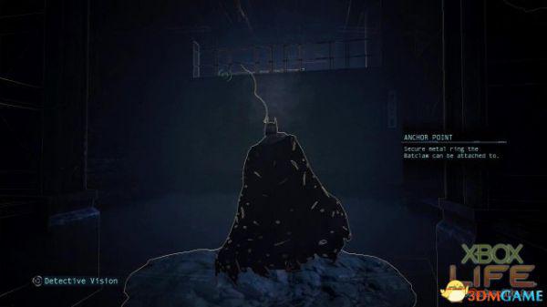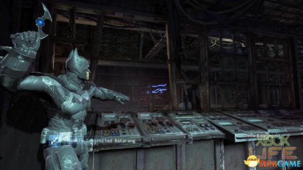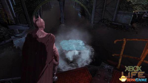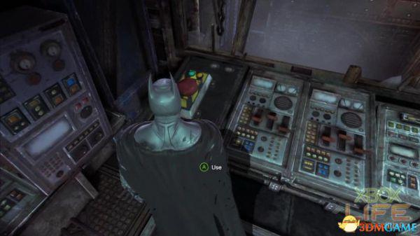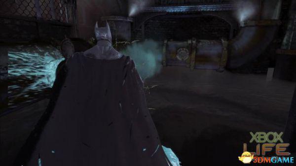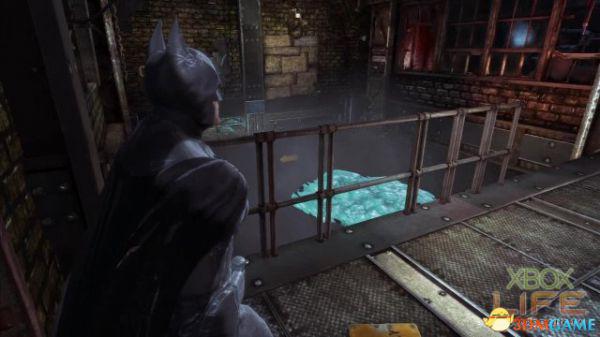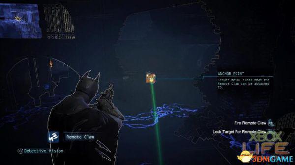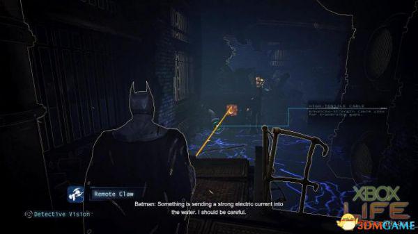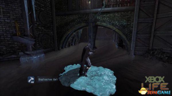 接着往拱形洞前方的水面投掷黏胶手榴弹,製造踏台后跳上去,用蝙蝠爪勾住裡头的铁环往裡头拉,把踏台拉到裡侧的平台之后再用绳索爬上去,左转来到有开关的房间。按下开关后,在原地用遥控蝙蝠镖往对面通电的地方飞过去,然后把通电的飞镖绕到左侧去撞击电箱。