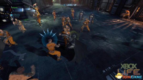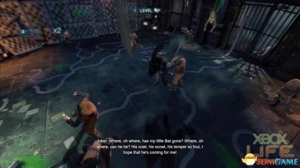 接着依照视觉提示下楼梯,一路通过几道门来到监狱B区,这裡会有一群囚犯,打倒他们吧。接着从有着火的门那里上楼梯,一直往前走会遇到之前被阿蝙打败抓起来关的Deathstroke。