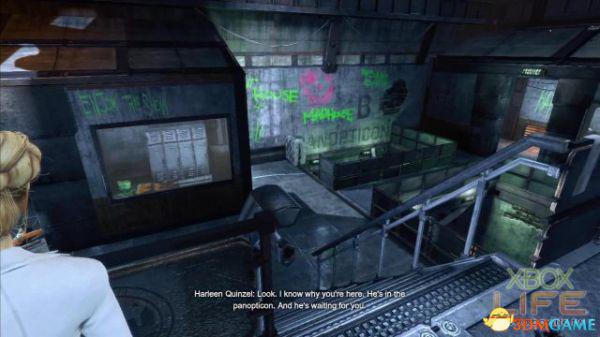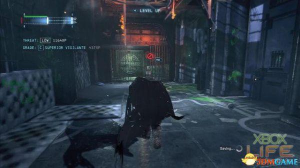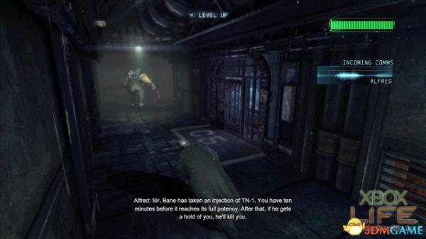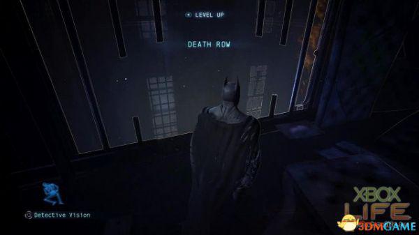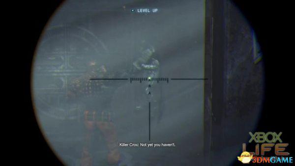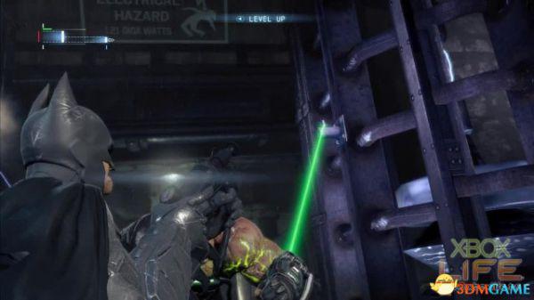 与阿福讲完话之后在原地回头会看到一盏红灯在闪,上方有绳索点,爬上去之后钻过前方的通风口来到死囚牢房。接着从栅栏的破洞跳到下方平台,会看到受伤的典狱长。典狱长提醒阿蝙背后有狙击手,而当阿蝙回头时,在第一篇就被打倒的Killer Croc突然现身把阿蝙抓起来,而狙击手也瞄準好阿蝙了。