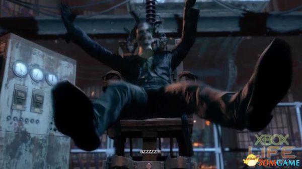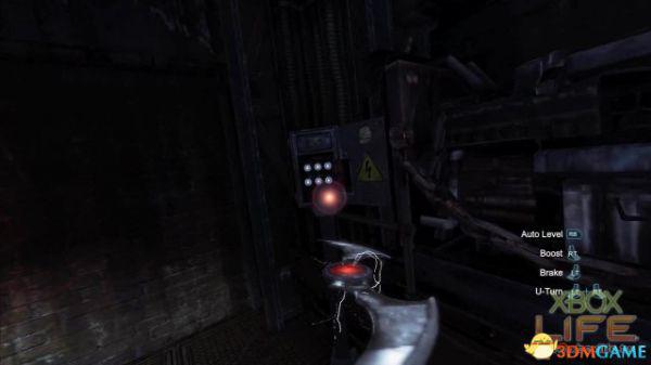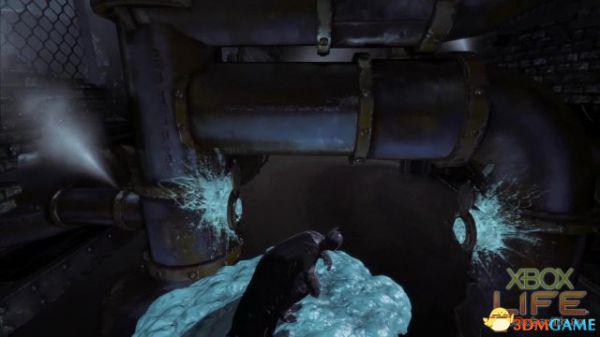 遇到横在前面的管子请蹲低身子,通过后立刻朝左侧的排气口投掷黏弹。接着往右流动后又是两个排气口,封住它们。最后前面上方有三个排气口,快速用黏弹全部封住让机械停下来,再用绳索爬到上方的平台,右转进门来到维修室。打倒里头的囚犯之后,用电击手套启动旁边的发电机,会有一台电梯摔下来。