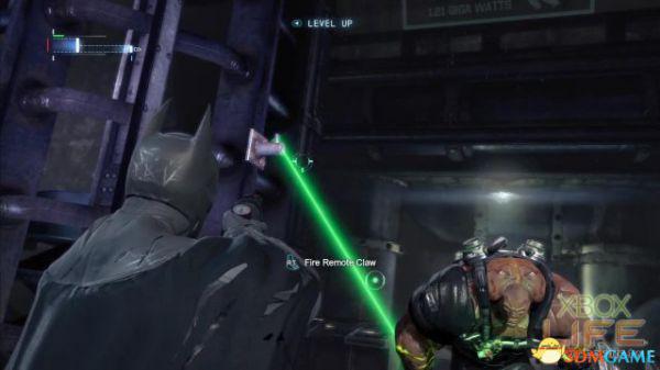 阿蝙总算是在药剂完全生效之前打倒班恩了,但是正当他喘口气通知阿福时,又被班恩突袭,整个人被打飞破墙摔到控制室裡。没想到此时班恩衝过来刚好在两面电墙的中间,请遵照画面提示按RT键射出绳索困住班恩吧!