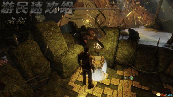 往左边走,后方有条小路上去会找到开启金子塔的开关。