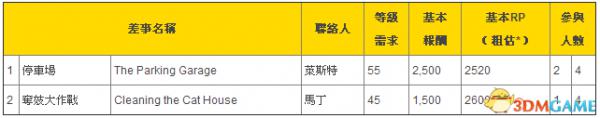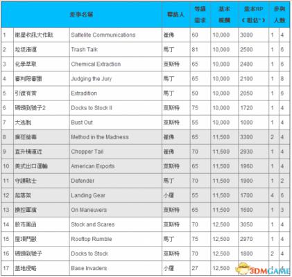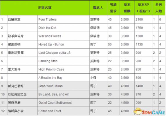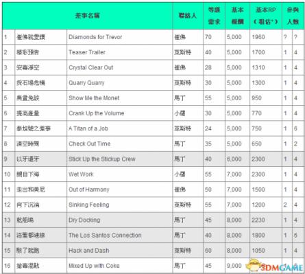 註:「基本 RP」為該差事單人進行可獲得的 RP 粗估值,多人過關或困難難度會加乘該數值。