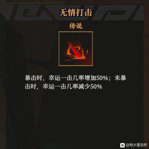 无情打击是《枪火重生》这款游戏中的一个秘卷,能够让幸运一击几率增加或者降低,这一秘卷搭配得当的话效果非常不错,玩家“49475147”带来了《枪火重生》无情打击秘卷组合推荐,一起来看看吧。