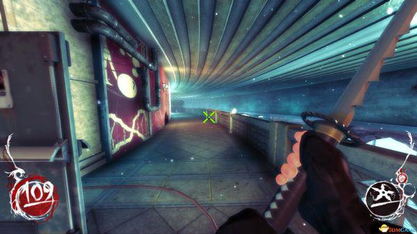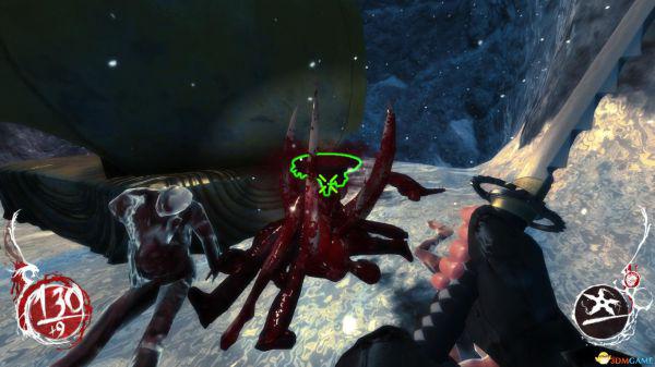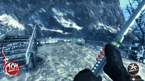 跟着任务走啊走,来到中厅,BOSS发觉自己变节了,于是看过场动画和BOSS比划了几招,然后和魔怪大干一场后,其他门都被封印了,从闪烁黄光的门进来,就是上图场景了;左侧木板背后就是一个破封印的鬼灯雕像,走绿色准心处的那楼梯上去;