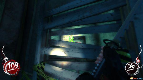 这个就是上来的楼梯,注意上图绿色准心处贴着墙一条很狭窄的通道,就可以沿着这条通道往前走,然后再到旁边的箱子角落了;