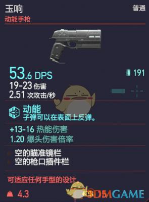在《赛博朋克2077》中,玩家能够体验到丰富的剧情,当然在体验剧情之余,也可以搜集游戏中五花八门的枪械,这也有游戏的一大乐趣。这篇《赛博朋克2077》玉响枪械图鉴为大家带来了游戏中玉响这一武器的相关信息,感兴趣的小伙伴就来看看吧。