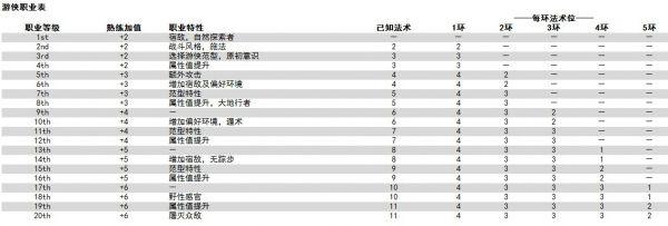 “游侠职业表”中记录了你可用以施法的1环及更高环阶法术位的数量。施展某个游侠法术时,你必须同时消耗其对应环阶的法术位。而已消耗的法术位则可以通过完成一次长休进行恢复。