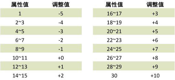 每种属性从10点开始,每提升2点获得1点调整加值(反之则是减值)。
