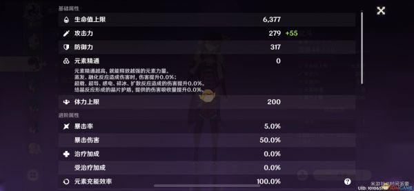 我们的北斗在没有装备圣遗物但装备了[以理服人]的时候,{基础攻击力(白色)}为279,{基础攻击力加成(绿色)}为55。不难看出{基础攻击力(白色)}是角色攻击力和武器攻击力的总和,并且{基础攻击力加成}也符合279*0.197的算法