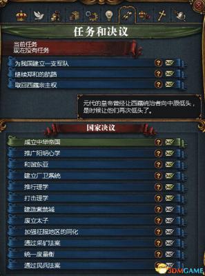本MOD为大明增加了相当多的决议和任务,使得其丰富性已经不下于欧洲如葡萄牙西班牙法国等一线国家