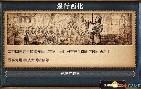2为大明提供了一个不西化,保留派系的可能。在天朝制度和派系都存在的情况下,可以通过与西方科技组国家接壤触发“向西方学习”的决议,