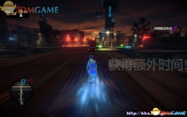 第一目标是探索裂隙,同样是跑酷竞赛,沿着圆形平台奔跑跳跃,落点越接近中心得到的分数越高。第二目标是收集病毒,在街道上抢夺指定的麾托车,将它送到车库里。