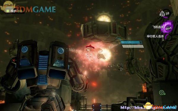 消灭飞行载具上的外星人,在一座大厅里遭遇伏击,其中有4座掠夺者,交织的激光线有很大威胁,它们的弱点在身后绿色的部位,快速冲到后面摧毁。
