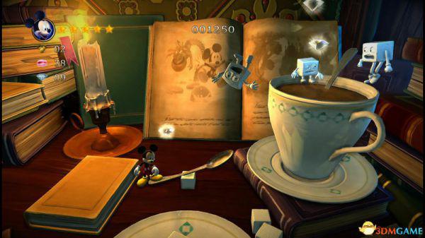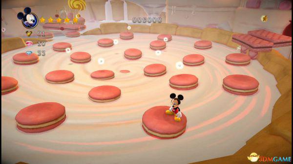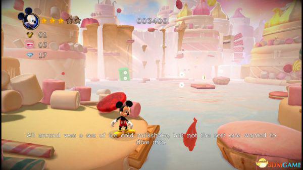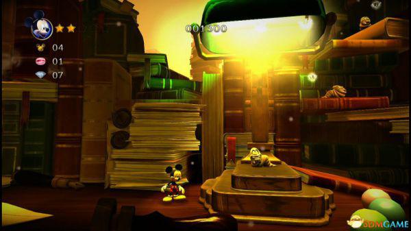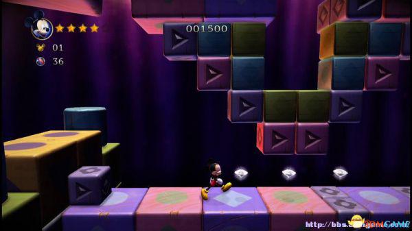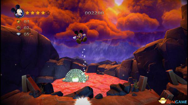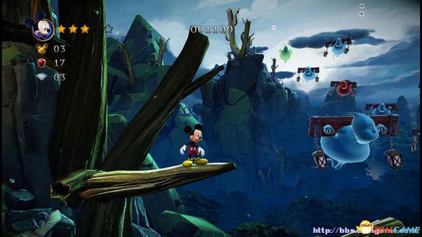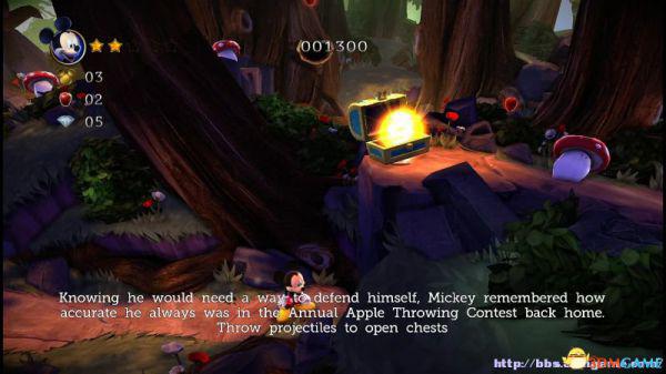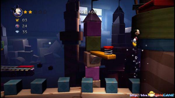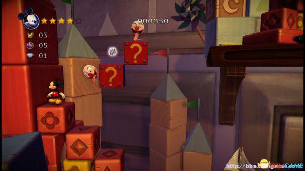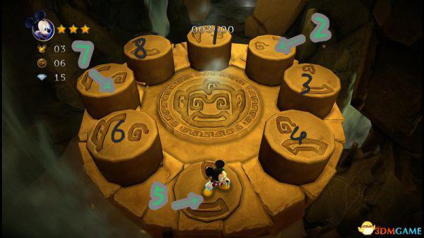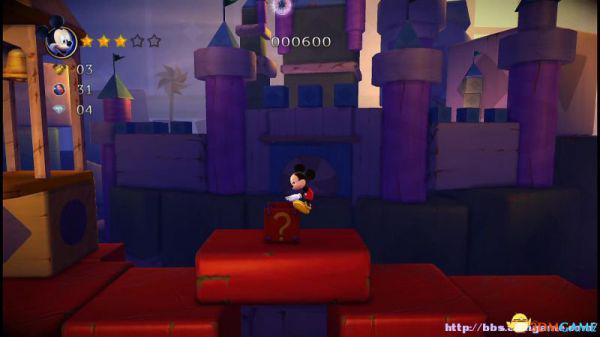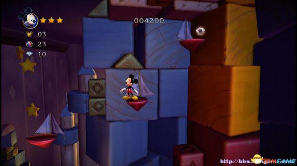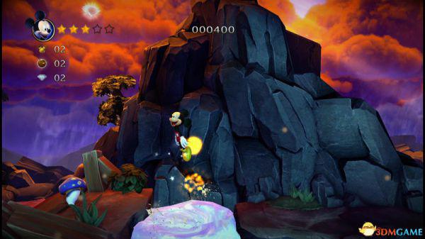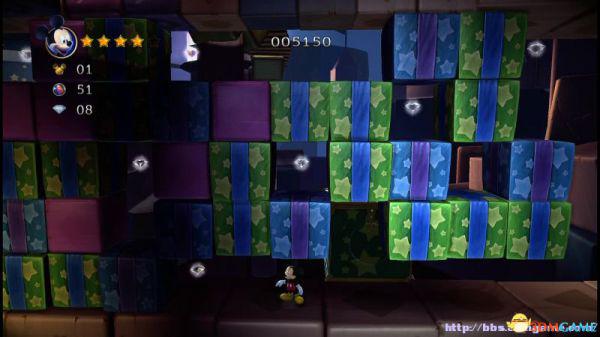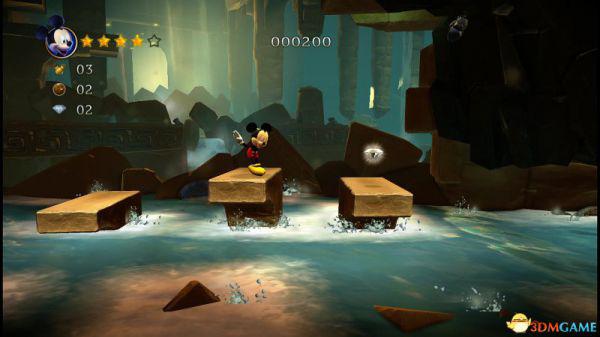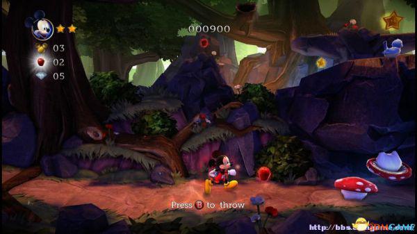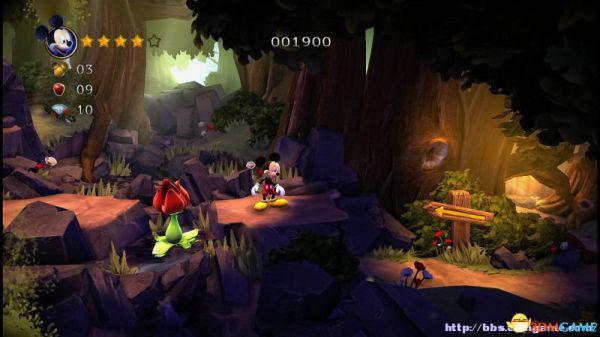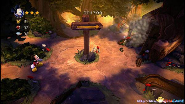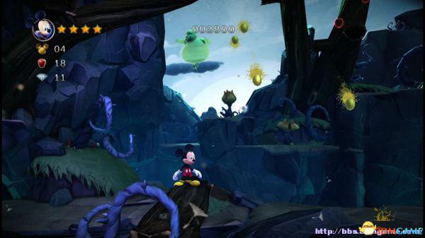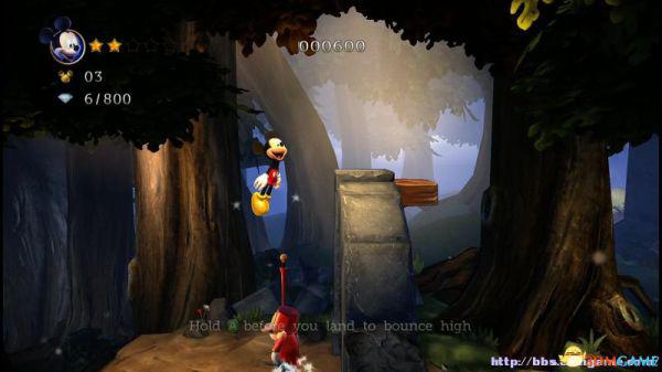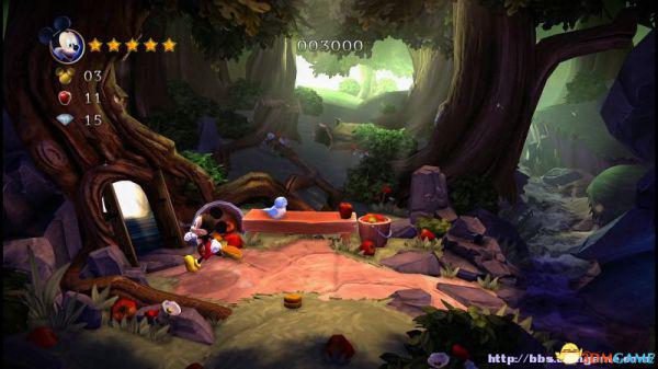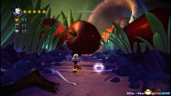 前方会遇到两顶小蘑菇,可以对它们使用践踏;然后会遇到了会移动的3只树桩,踩在它的头顶上可以获得空中的钻石(3颗),在路上可以获得一颗金星(也就是米奇的HP)。