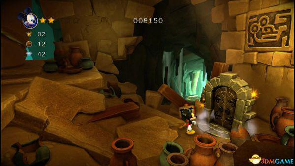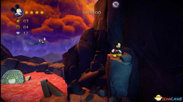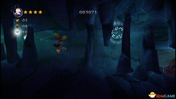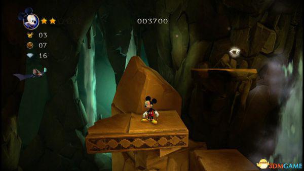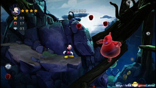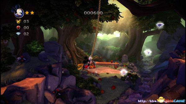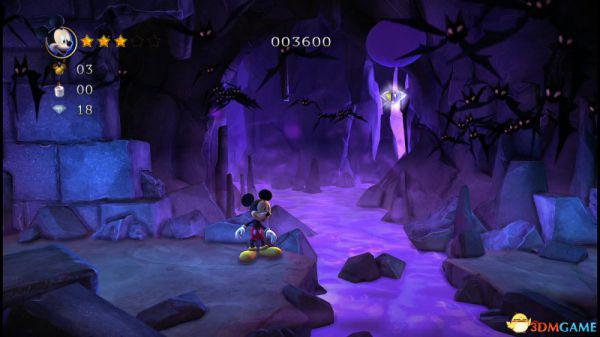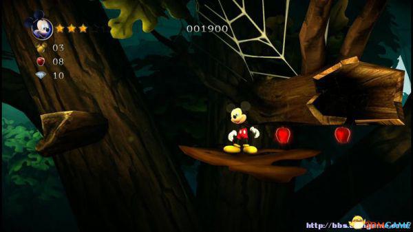 到达地面后进入左侧的山洞可以获得8颗钻石和金色米奇头(就是米奇的命),要当心洞内的蝙蝠,因为空间不够大,用苹果砸向它就最好不过了。