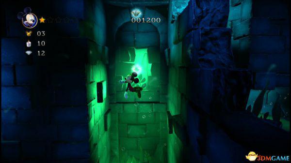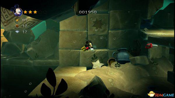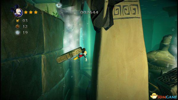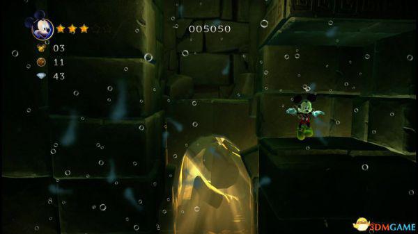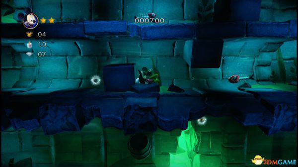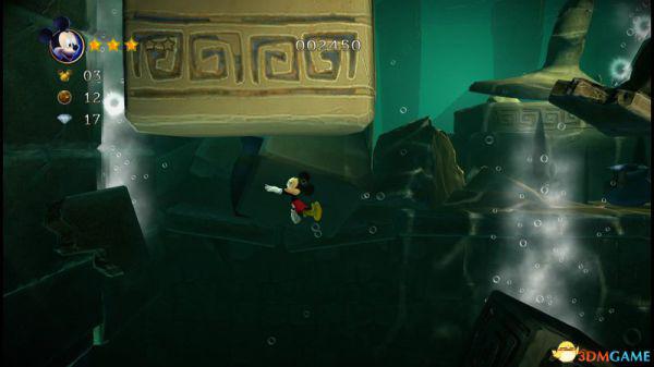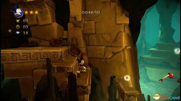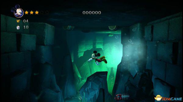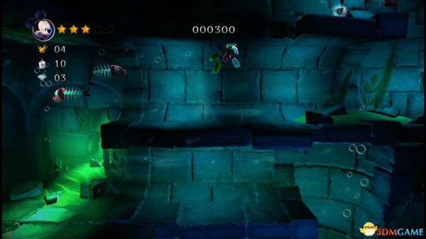 上到四层会看见三条来回的骨鱼,至于米奇生命和两颗钻石,唯有先跟随上方的骨鱼获得生命后,再潜到四层的底部(游在底下骨鱼的右侧)返回四层的入口处便能全数获取。