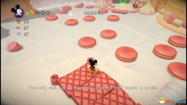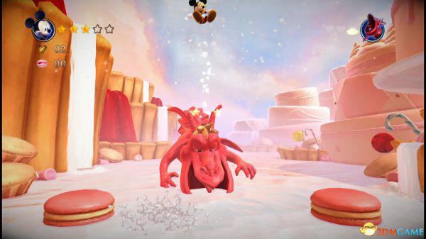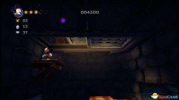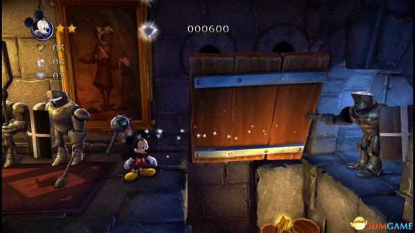 来到一名睡着的红衣守卫,踩在他头上便可令其消失并且将米奇弹到高处跨过石门。
