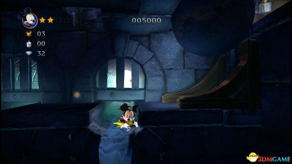 step6.走到漆黑走廊的右侧尽头后又掉落到下层,此时左侧会出现一嗰大铁球,米奇需要快速往右侧斜坡奔跑。