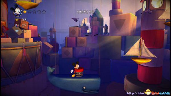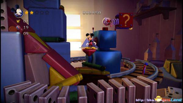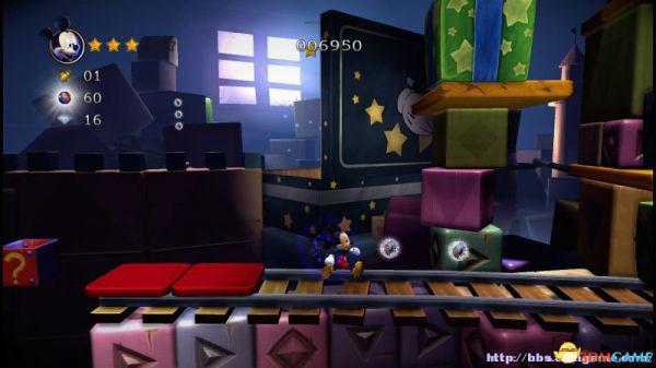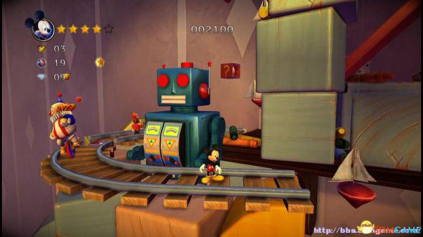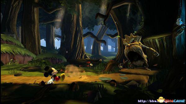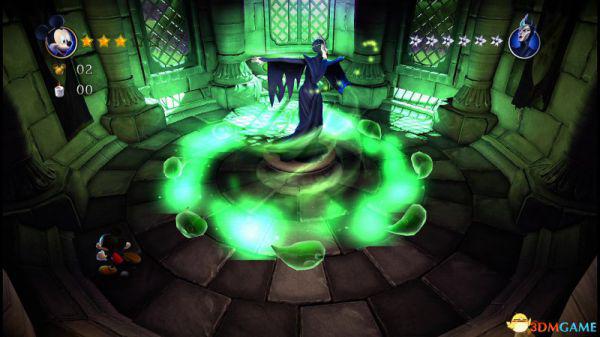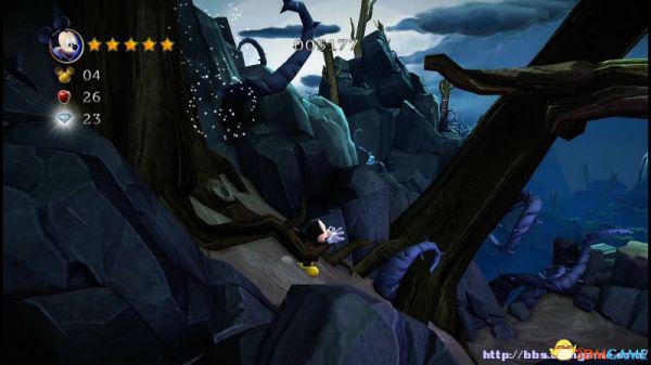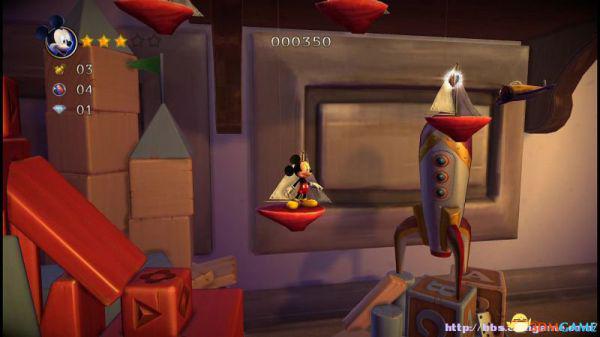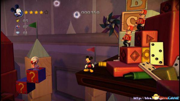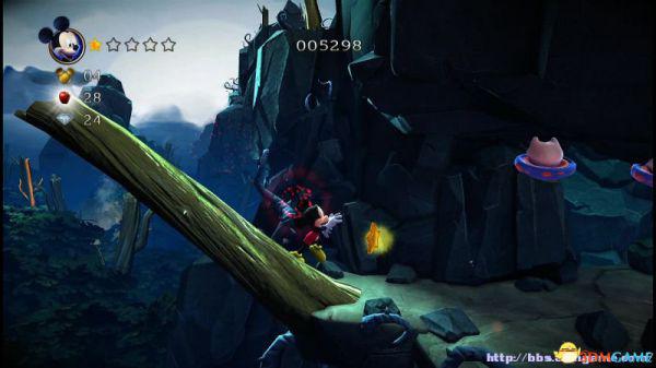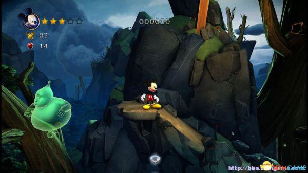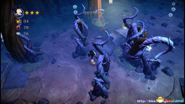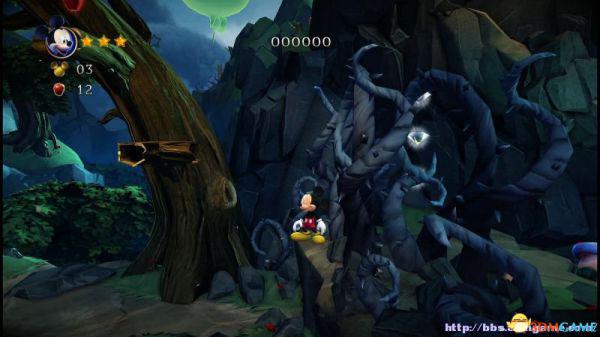 ②:(3~4血)先是往左侧弹弹跳,登上左侧斜坡后会滚回来。这里有嗰窍门,一开始就站在斜坡的底部(紧靠),老橡树就不会踩中米奇,当其跳上斜坡马上跳跃即可完美躲避;
