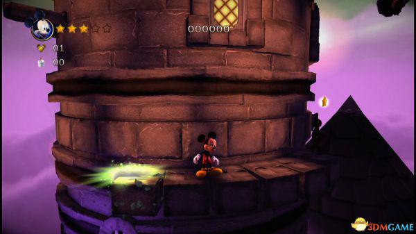step2.此时女巫米拉贝尔用魔法溶解露台右侧的围栏,此时米奇便能够跳往右侧的限时生成木板跳到上方的石台上。