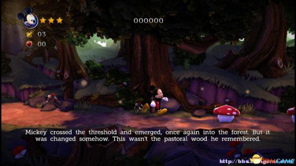 旁白:米奇穿过了门槛回到了森林内,可是这嗰森林与此前的田园风光却不相径庭。