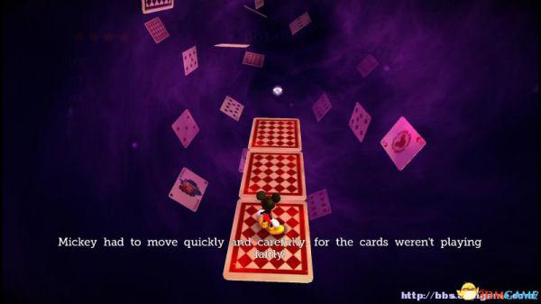 step7.米奇需要快速从扑克牌制成道路往前奔跑(不通过也没所谓),要当心那些小丑的扑克牌,一旦踩上去便会掉落(也就是失败)。