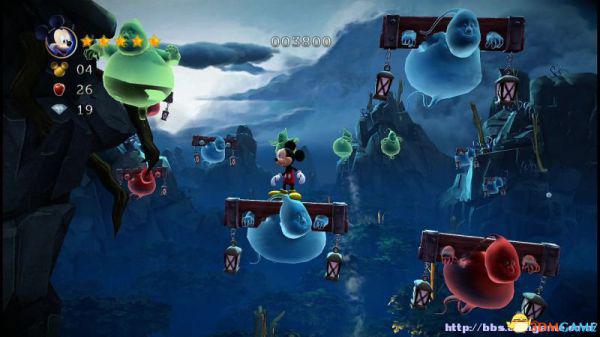 会看见一只绿色的幽灵(绿色幽灵不会动,弹性很好;蓝色幽灵会左右移动;红色淘气幽灵都是要整蛊米奇的,所以不要跳在他身上)通过他可以弹到右侧高台上。