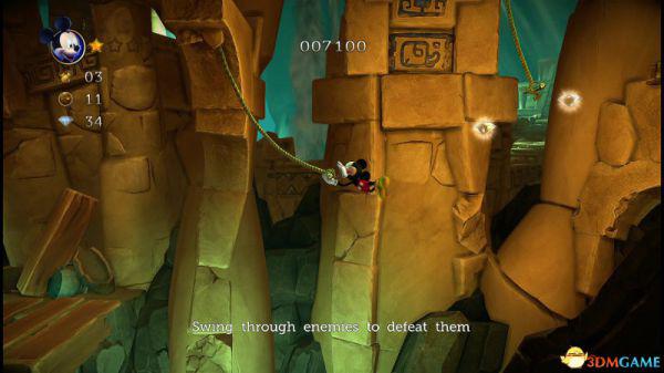 来到最高位的限时木板,并抓住右侧的绳索,跳往有的木板,但木板会消失,此时米奇正好落在下方的绳索上,荡至右侧的石台。