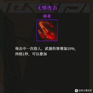 在《枪火重生》这款游戏中, 秘卷数量是相当多的,其中不乏一些机制比较奇特的秘卷,无情连击就是其中之一,玩家“49475147”带来了《枪火重生》无情连击秘卷组合推荐,感兴趣的小伙伴就来看看吧。