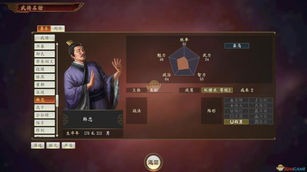 韩忠是《三国志14》这款游戏中的一位武将,在三国的正式历史中也有着其姓名,有小伙伴想要了解该武将在游戏中的具体表现如何,那么就来看看“abcdqqq2”分享的《三国志14》韩忠武将点评吧。