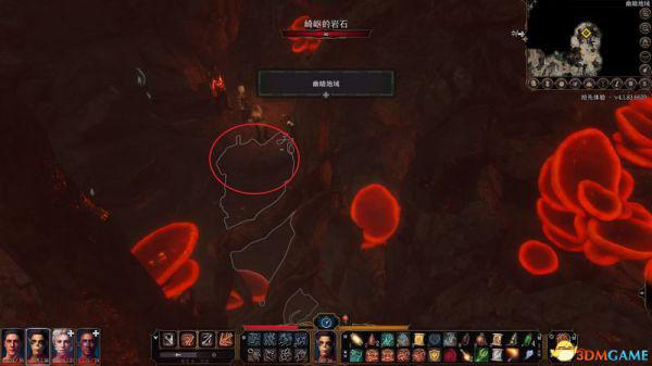 注意图中位置可以跳下悬崖,沿着红线找到一块石头。