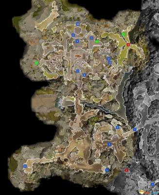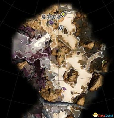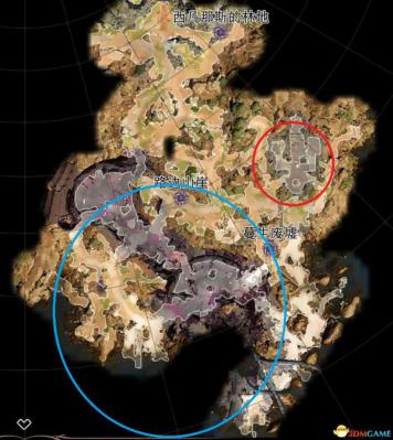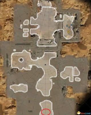 玩家首先要在路边山崖到蔓生废墟一线的南边(蓝圈)晃悠,找到失散的另外4名队友。