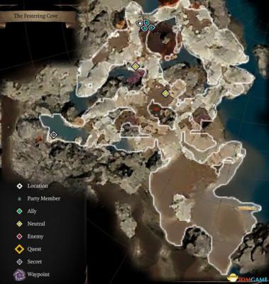 参考前序大地图,可以在海滩东南部找到鱼人洞窟(溃烂洞穴)。