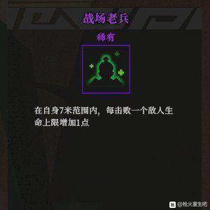 战场老兵是《枪火重生》中的一张秘卷,玩家可以通过这张秘卷来不断的提升自己的生命值上限,玩家“ 49475147”为不了解该秘卷属性的小伙伴带来了《枪火重生》战场老兵秘卷组合推荐,感兴趣的小伙伴就来看看吧。