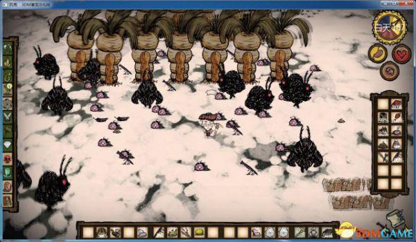 这一关不要被永冬吓到,资源是比较丰富的。在尖塔柱关住的区域保证会有矿区森林区草原区草地区。你要做的是在第五天之前,收大概一组木,20个牧草20个树枝,并且找到牛群。这难度不大,至少我玩这一关时到第五天还剩大概10多个萝卜和N个浆果。