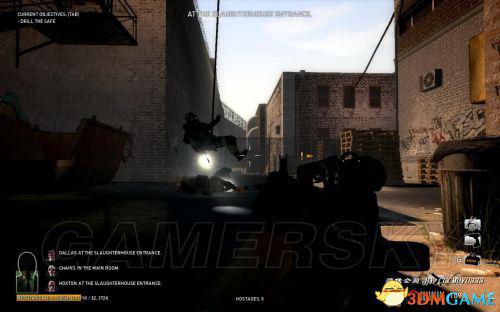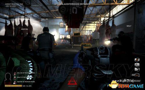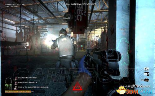 3:在屠宰场发现卡车倒挂着,先解决卡车边上的警卫,在卡车上激活炸弹,炸开大门;然后在掉下来的保险柜上激活钻头,之后就是防守了。在这里进去前的转弯隐蔽处放个弹药包,先守住外面,让你的队友解决里面的敌人;由于电脑AI不高会一直跟着你跑,所以你要时刻注意,守住里面的人最好有3个,一旦发现好几个跑出来和你混那里面一定收不住,然后内外交加,GAME OVER。