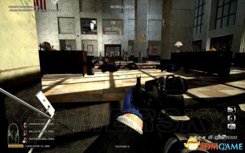 2:进去之后按F键开始打劫,先把里面的保安都杀了;等一会儿外面会来很多警察,边打边看周围的任务标示(一个黄色的标示,透过墙壁都能看到,仔细点观察);杀了银行管理员拿到钥匙后开门前去钻头处开启钻头,然后守住。