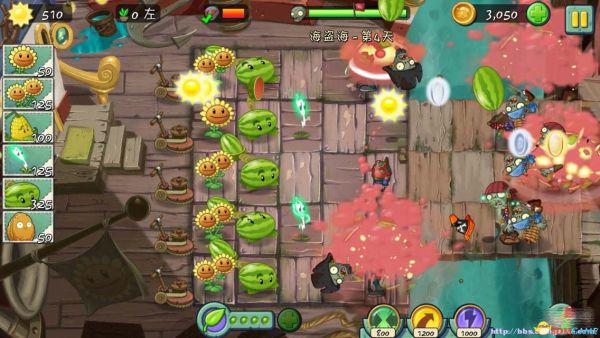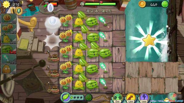二星建议用盾刷,本关最大的问题是跨海夹板,在海盗船长跳过来的时候最好把他击落,以防任务功亏一篑,可以放一个坚果墙做阻挡。生产1750阳光需要双头向日葵。