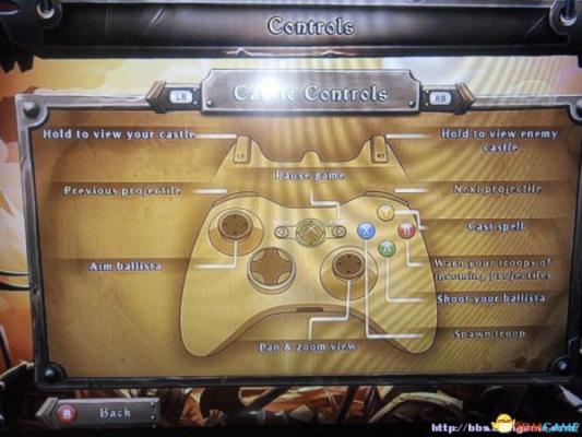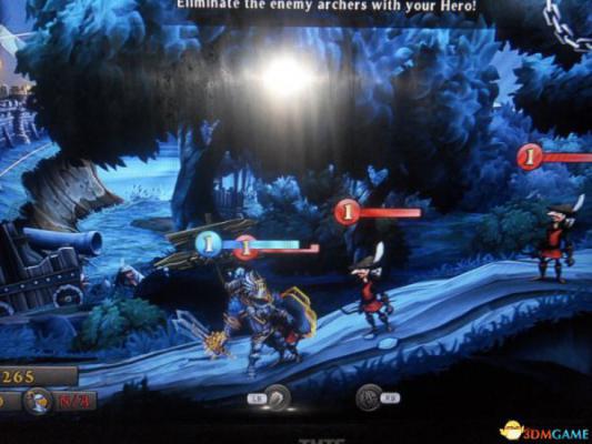 step3.按Y键,进入英雄菜单,下方菜单栏显示出Gareth先生的头像,按Y键确认召唤出Gareth先生,按左摇杆(配合右摇杆选择场景)选择Gareth先生的登场位置。然后就可以操纵Gareth先生进行横版动作游戏,击杀敌人的弓箭手,X键是平砍、B键是升龙斩(暂时不可以按住RB键使用Gareth先生的弓箭)。每一次Gareth先生登场都是有时间限制的,而此次是不限时的,尽情杀戮吧。杀光敌人的步兵后,按住Y键退回城堡的弩车控制上。