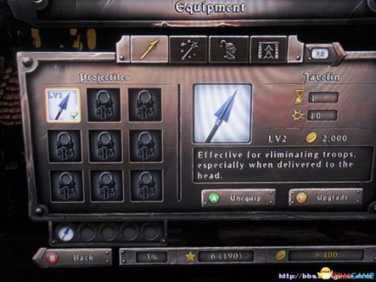 进入商店菜单后,按LB、RB键选择道具的种类:弩车、咒语、士兵、城堡(外墙、生产单位)。