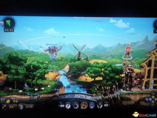 虽然是地平无法使用地平抛物线,但是玩家还是可以利用高抛物线(穿过第一座山峰)攻击敌人的堡垒,只是效果不太理想。此次夺旗,我方有了岩石巨人这强大的帮手,推倒敌人的大门是指日可待的事情,多按Y键,为岩石巨人补血、加防。